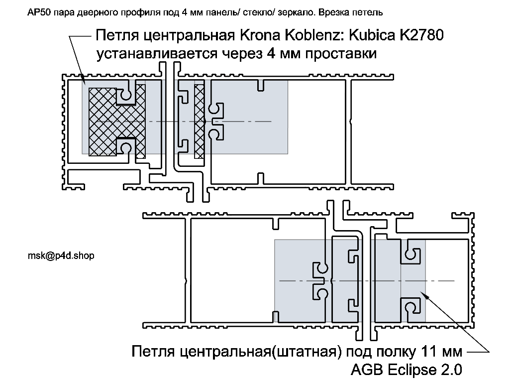 APD50 жесткий профиль дверного полотна универсального открывания подготовлен под фурнитуру AGB Eclipse 2.0 петли и замки типа Polyaris с лицевой планкой 3х18 мм. Подходит под облицовку тонкими панелями 3-4 мм в том числе стеклом/ зеркалом. Петли находятся внутри профиля и не касаются отделочных панелей. Профиль дверного полотна APD50 совместим и является продолжением профиля дверной коробки APK50 скрытого монтажа. Профиль можно подобрать по цвету анадировки к интерьеру или фурнитуре